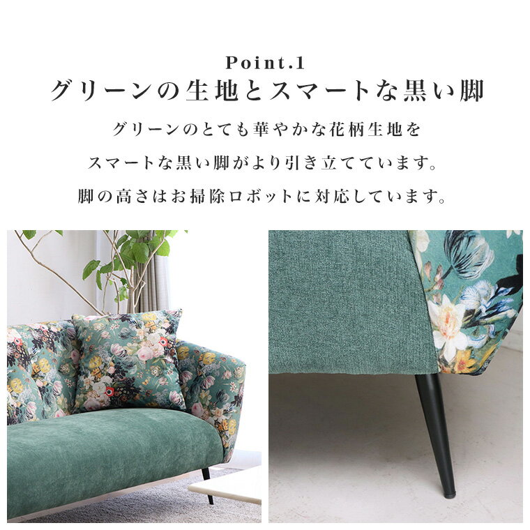 サイズ [ 外寸 ] 全体:幅160×奥行80×高さ73cm 座面高43cm / 脚高19cm 重量:約27kg [ 耐荷重 ] 天板:約150kg 材質 張地:ポリエステル 芯材:木枠 / 積層合板 中材:ウレタン / Sバネ / ウェービングベルト 特徴 完成品 (脚のみお客様取り付け) お掃除ロボット対応 説明 ・グリーンのとても華やかな花柄生地をスマートな黒い脚がより引き立てている、高級感と上品さを併せ持つ2人掛けソファ。