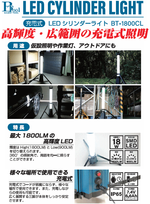 BASICTOOL 充電式 LEDシリンダーライト BT-1800CL 高輝度・広範囲の充電式LED照明 最大1800LMの高輝度 LED、High 1800LMとLow 900LMに切替られます。